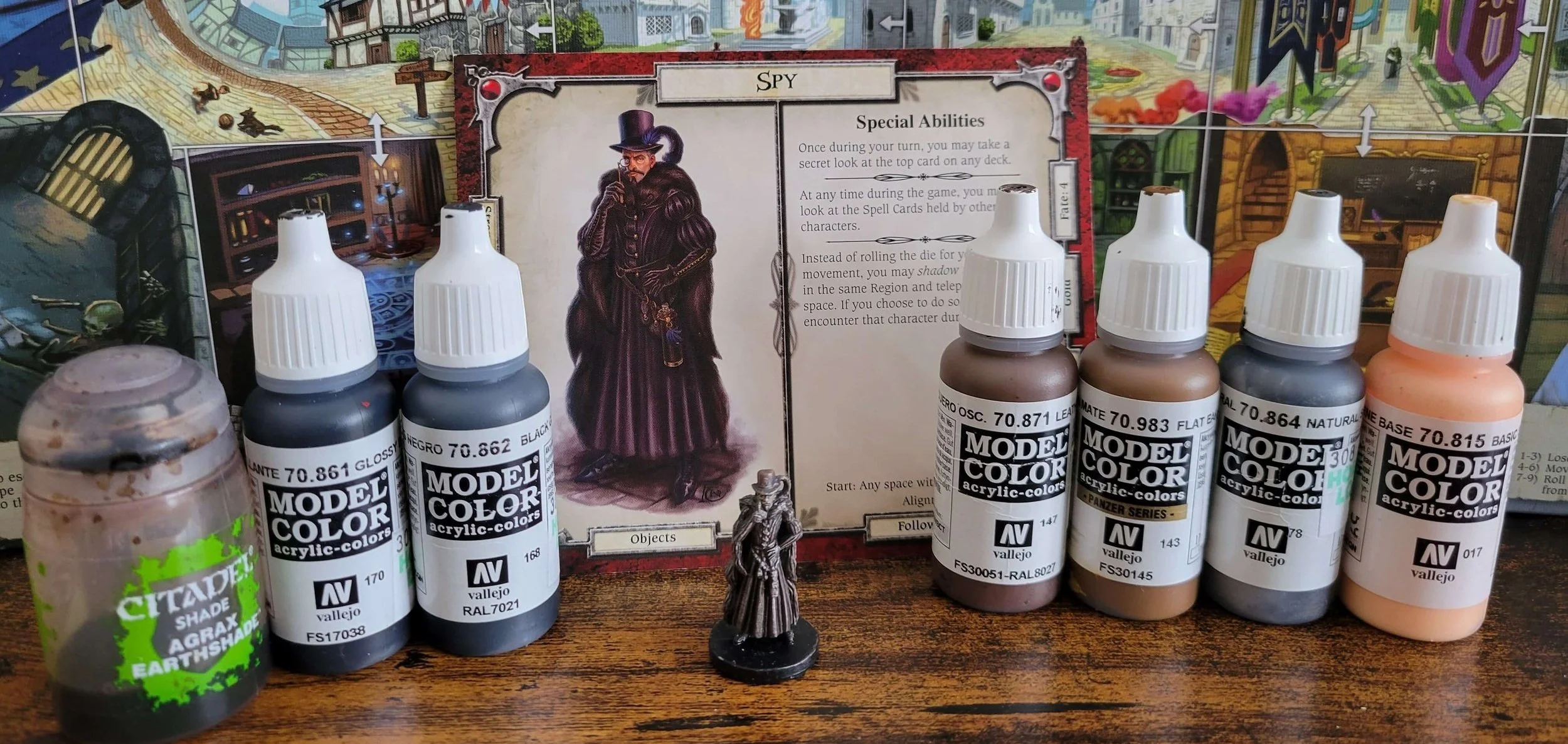 The spy is another really easy miniature to paint. It also gives us time to practice mixing some colors. There is a hue in the coat that is not necessary brown red or blue, so mixing them to get the color or the card is necessary unless you find the perfect mixture online and don’t want to try mixing for yourself. I went with a mixture of browns dark blue and flat red to get the desired effect. One thing that I would recommend is that on the dry brush after the Agrax Earthshade wash, is to use the flat earth as the drybrush highlight as the white seemed to be a little to strong on the miniature to my taste. Finish with a sealer after basing with a flat or glossy black paint.